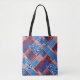 Um saco de designer moderno com um padrão de retalhamento de jeans azuis com padrões de designer vermelho e branco. Você pode personalizar, dimensionar ou excluir o texto do monograma, bem como dimensionar ou girar o padrão, se quiser.