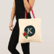 Esta bolsa faria um acessório de excelente para aquela pessoa especial na sua vida! A design apresenta uma rosa vermelha sobre um fundo azul, um monograma totalmente personalizável, e muito espaço para livros escolares, ferramentas de jardim, compro de mercearia, ou o que você quiser! Faz um presente de excelente para uma mãe, mãe em direito, irmã ou professora.