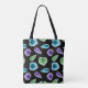 Este saco de totas é mostrado num impressão de palmeiras tropicais preto multicolorido. Tamanho médio mostrado na imagem da ação vecteezy.com