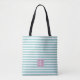 Saco de Tota de pré-disquete com fundo azul claro e listras brancas. O monograma personalizado de três partes é escrito em fontes serif que podem ser personalizadas.