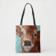 Esta bolsa é agarrada por uma pintura de um bezerro giro feita com um fundo aqua. Ajude o ambiente comprando sacos reutilizáveis.
