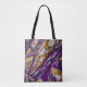 Um design abstrato em roxo, dourado e branco, que se assemelha a um terreno rochoso, cobre esta Bolsa Tote para Ombro.