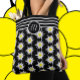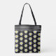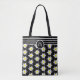 Um saco elegante de tota preto e branco com um padrão floral e quatro faixas horizontais no topo. Personalize-o com uma inicial. Este design também está disponível em ciano, verde-claro e vermelho. © ArianeC Ilustrações — Todos os direitos reservados