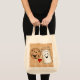 Desenhos animados festivos do divertimento da bolsa de compra do vidro alto do leite branco com uma cara feliz do sorriso, e um biscoito saboroso dos pedaços de chocolate. São ambos que sorriem, com um coração vermelho in-between. Escuro e claro - esquema de cores marrom com padrões e cores do divertimento. Este design está disponível em muitas seleções diferentes do produto.