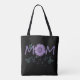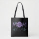 Um toque de elegância floral para uma mãe maravilhosa. Este saco de totas contém a palavra "MOM" em letras maiúsculas roxas adoráveis, realçadas por um girassol roxo gracioso como "O" e delicadas borboletas azul e roxa de Watercolor. Prática e na moda, é uma maneira séria de mostrar a sua apreciação deste Dia de as mães.