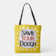 "Save Your Dough" é um design de texto divertido com uma forma de sotaque branca rodeada por pontos brancos texturizados.