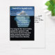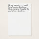 Uma carta para as pessoas para as quais você gostaria de explicar Tourettes. Ele tem uma imagem "Tourettes é apenas a ponta do icebergue" na frente com uma parte traseira que começa com "Oi, meu nome é ______ e eu tenho síndrome de Tourette. Aqui estão algumas coisas que gostaria que vocês soubessem sobre mim:" e podem ser personalizadas para dizer o que você quer que as pessoas saibam sobre Tourettes.