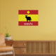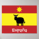 Poster de bandeira de Espanha, com touro espanhol engraçado e um sol sorridente.