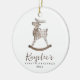Toy Reindeer Baby's First Christmas Cerâmica Ornament — O precioso personalizado do ornamento de Natal do modelo apresenta um adorável cavalo de balanço de uma rena de brinquedo de aquarela. As caixas de texto permitem uma fácil personalização do nome de qualquer bebê em um tipo de letra de escrita caligráfica manuscrita, e o ano de nascimento em um serif simples e minimalista. Ambos os lados desta decoração personalizável, neutra em relação ao gênero da árvore de manutenção são idênticos.