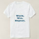 O design t-shirt apresenta o slogan ousado "Work, Win, Repeat" na tipografia dinâmica e moderna. As palavras "Trabalho" e "Vencer" são destacadas com cores fortes e contrastantes, enquanto "Repetir" completa a mensagem em uma fonte um pouco menor, mas ainda impactante. O design transmite motivação e determinação, com linhas agudas e visuais enérgicos e elegantes para enfatizar o ciclo contínuo de esforço e sucesso. Perfeito para uma mentalidade de "go-getter", o estilo minimalista, mas poderoso, o torna ideal para o visto ativo ou casual.