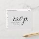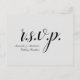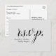 Este design de cartão postal R.S.V.P. tradicional e nostálgico apresenta a mensagem "r.s.v.p." na frente, juntamente com um nome de evento/ocasião personalizado. Ele também apresenta um formulário de RSVP personalizado na parte traseira para que o destinatário seja concluído, juntamente com um endereço personalizado ao qual as placas de RSVP completadas seriam enviadas. Cartões de RSVP como este podem ser usados para descobrir quem estará participando de um chá de fraldas, de um chá de casamento, de uma recepção de casamento, de uma festa de aniversário ou de alguma outra celebração.