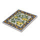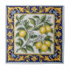 This traditional Italian majolica ceramic tile features a central illustration of a lush lemon branch heavy with citrus and delicate white blossoms, framed by an ornate Majolica-style border of golden scrollwork against a deep cobalt blue background.
