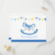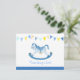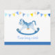 Chá de Bebê Menino - Traga um Livro cartão postal nas cores azul e amarelo. Perfeito para festas de baby shower onde você gostaria que os convidados trouxessem um livro para criar uma biblioteca. Que melhor maneira de dar as boas-vindas ao seu menino recém-nascido no mundo do que mostrando o quanto ele é amado por seus amigos e familiares. Dando presentes muito especiais para você e seu bebê menino por anos vindouros. Pintura em aquarela de cavalo de pau por e design por Sarah Trett para www.mylittleeden.com