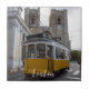 Tradicional elétrico amarelo em frente à Catedral de Lisboa, Portugal