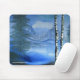 Mousepad com uma imagem da tradicional pintura de Dawn K. Williams, "Lago Tranquilo", uma paisagem azul e verde que inclui pinheiros e pinheiros, colinas e um lago refletor.