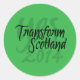 Um autocolante verde redondo com "transformar a Escócia" em primeiro plano e "Sim 2014" em segundo plano.
