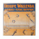 Poster de circo de vintage mostrando trapeze, acrobatas e trampolina voadora, por volta de 1905.