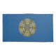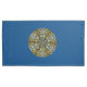 Uma mandala tipo rendas em azul escuro com estrelas azuis brilhantes e douradas e um círculo brilhante de gradiente de explosão solar atrás faz um design divertido que traz à mente um céu noturno e um dia ensolarado com uma imagem.