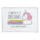 Este travesseiro de unicórnio colorido apresenta um unicórnio adormecido e cor-de-rosa com o texto "Sweet Dreams Loading" e uma tela de carregamento de arco-íris pastel.