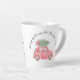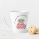 Este design Latte Mug, feriado básico, apresenta um carro vermelho com uma árvore verde. O texto arquivado diz, "Trazendo para Casa a Árvore de Natal" e pode ser personalizado.