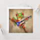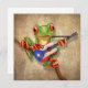 Este design do artista Jeff Bartels apresenta um pequeno sapo de árvore verde segurando uma guitarra acústica riscada e vestida. A bandeira de Porto Rico é pintada no velho violão dando-lhe um olhar patriótico. O adorável músico do sapo da árvore está sentado em um pequeno galho e está olhando para frente com seus grandes olhos vermelhos. A cabeça e o corpo pequenos, além dos detalhes na pele e no violão, criam uma bela combinação de desenho animado e aparência realista. Este padrão único e patriótico guitarrista sapo de árvore porto-riquenha é perfeito para todos os amantes de animais e música.