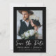 Este casamento tendencioso salve o cartão de anúncio de data com duas fotos e branco chic salve o roteiro de data lettered em um plano de fundo preto elegante. O verso é uma foto de cheio. Avise aos hóspedes que você os convidará para o próximo casamento com esta simples foto minimalista, salve o cartão de data (os convites clássicos de coordenação de casamento podem ser enviados posteriormente e estão disponíveis para serem comprados separadamente).