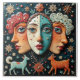 Três rostos de mulheres com diferentes cores da pele, a central é meio branca e meio azul, cercada por estrelas e duas criaturas caninas em fundo escuro.