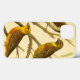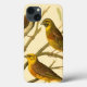O artista W. Rutledge capturou perfeitamente as cores vivas dessas aves domésticas. Obtenha esta pintura simples, mas lindamente realista. Vista lateral de dois pássaros amarelos e um pássaro mais escuro em um galho e olhando em direções diferentes.