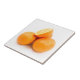 Fotografia de três laranjas com meia laranja equilibrada sobre fundo branco.