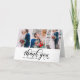 Elegante, moderno e caprichoso cartão de colagem de três fotos para agradecer aos seus convidados por fazerem parte do seu dia de casamento. Este cartão de agradecimento personalizável apresenta sobreposição de caligrafia moderna preta. Este design também está disponível em outros cartões e cores.