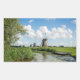 Um autocolante de fotos retangular de três moinhos de vento ao longo de um canal com barcos e sementes sob um céu azul com nuvens inchadas criando uma cena pacífica no campo holandês de Leidschendam, Países Baixos.