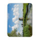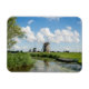 Fotografia retangular de souvenir de três moinhos de vento ao longo de um canal com barcos e sementes sob um céu azul com nuvens fofinhas criando uma cena pacífica no campo holandês de Leidschendam, Países Baixos.