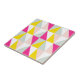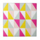 Azulejo cerâmico apresentando um padrão geométrico moderno de triângulos rosa e amarelos.