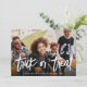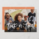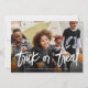 Compartilhe uma foto das suas pequenas roupas de Dia das Bruxas com o nosso cartão com fotos adorável. Design apresenta sua foto horizontal orientada com "truque ou trata" na parte inferior em caracteres modernos de script desenhados à mão branca. Personalize com sua saudação personalizada, nome(s) e o ano abaixo.
