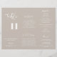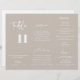 Transforme esta folha de papel num moderno menu tríplice de casamento neutro, número da mesa e programa com informações sobre a linha do tempo, coisas que são boas de conhecer, menu comida e bar. Basta dobrar, gravar a costura na parte de trás e usar este moderno programa de papelaria de casamento para a sua recepção de casamento. A cor de fundo pode ser alterada na ferramenta design, se quiser!