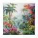 A Watercolour landscape of a tropical forest with colourful flowers
