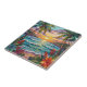 Pretty tile with a gorgeous ai impasto oil painting style illustration of the blue ocean, a sandy beach surrounded by palm trees at sunset.