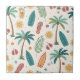 Bright tropical pattern ceramic tile featuring palm trees, surfboards, citrus slices, flip flops, and fruity drinks in a fun summer-inspired style. Ideal for beach lovers, surfers, vacation fans, and anyone who loves colorful tropical aesthetics.