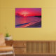 Gentle waves roll onto the sandy shoreline while a distant boat drifts across the calm water, creating a peaceful and romantic coastal atmosphere. The vibrant colors and dramatic sunset reflections make this artwork a stunning focal point for any room.