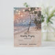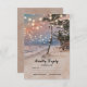 Vintage praia destino casamento cartões de rsvp com um cenário romântico de praia tropical por pôr do sol com palmeiras escorrentes e luzes de cinzas.