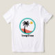 Minimalist logo with a palm tree silhouette inside a circular badge. Bold, clean lines with turquoise, coral, and yellow colors. Ideal for Stickers, Mugs, and T-Shirts. Modern and striking tropical design.