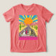 T-Shirt em uma ilustração de cinco gatos elegantemente vestidos vestindo óculos de sol cavalgar em uma paisagem vibrante no deserto. O pano de fundo apresenta cactos, montanhas, e um sol radiante, que põe o sol. O estilo pop de arte caprichosa evoca uma vibração divertida e retrógrada.