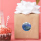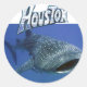 Autocolantes redondos com uma fotografia de um tubarão-baleia e tem a boca aberta um pouco. No topo, o adesivo tem um nome, que você pode personalizar. Criado por Darla Beamon © 2012