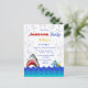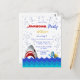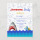 Um tubarão e sob a água do mar, chamado 9º convite de aniversário. Fundo branco, bolhas, ondas azuis, mergulhador e tubarão. Modelos para o nome da criança, 9 anos de idade e detalhes da festa, letras azuis, vermelhas e amarelas.