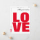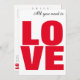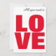 Este é um cartão postal de saudação. A palavra AMOR está em letras grandes e ousadas vermelhas. No topo da lista, em uma fonte preta, estão as palavras "Tudo que você precisa é". Na parte traseira deste cartão há uma área para o seu endereço de devolução. Também há linhas definidas para o endereço de correspondência. Se você não quiser usar este cartão postal, remova as linhas definidas e use-o com um envelope.