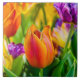 Tulipas coloridas num leito de flores. Praticamente todas as cores do arco-íris estão presentes. Bela e positiva cena floral. Fotografia macro.