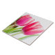Azulejo cerâmico com uma bela fotografia em primavera com 2 tulipas cor-de-rosa e folhas verdes brilhantes.