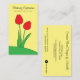 Um cartão de visita moderno mostrando uma ilustração original do Mango Moon Studio com duas tulipas vermelhas marcantes contra um fundo amarelo alegre na grama, criando uma obra-prima visual que captura maravilhosamente o espírito do seu compro florista. Adicione o nome, o slogan, as horas e os detalhes do compro florista.