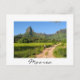 Cartão postal de uma turista andando de bicicleta em uma estrada de terra com a montanha Rotui ao fundo na ilha tropical de Moorea, perto de Tahiti, na Polinésia Francesa com uma borda branca e o texto: 'Moorea'.