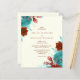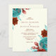 Este convite romântico para o casamento floral apresenta buquês florais azul-turquesa e cor-de-ferrugem em dois cantos. Os nomes do casal aparecem em fontes clássicas do serif de ferrugem, com o texto restante em itálico, em um fundo de marfim.